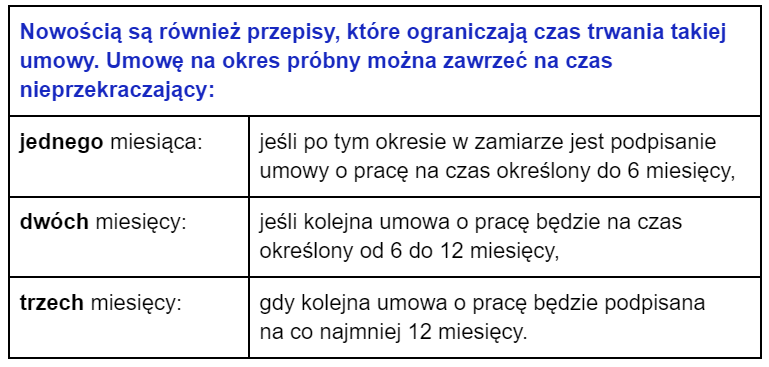 Do tej pory ponowne zawarcie umowy na okres próbny z tym samym pracownikiem było możliwe jeśli pracownik ten miał zostać zatrudniony w celu wykonywania innego rodzaju pracy lub po upływie co najmniej 3 lat od wygaśnięcia lub rozwiązania poprzedniej umowy o pracę.